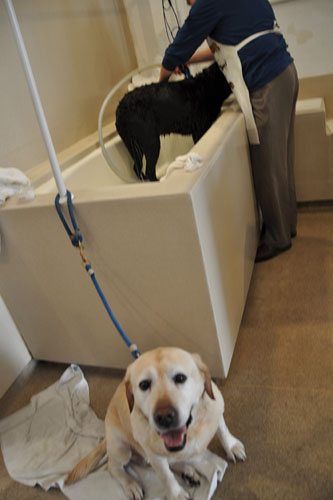 The dog wash is super-nice. You pay $12 per dog, which includes the tub, aprons, some basic shampoo, and towels, then you can pay a little extra if you want premium shampoo or conditioner. We did standard shampoo, then upgraded Rosie with conditioner to bring out the curl in her fur.
